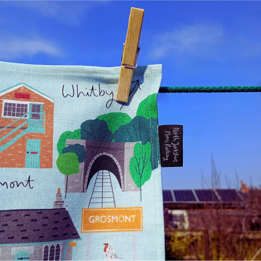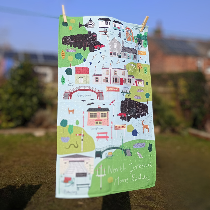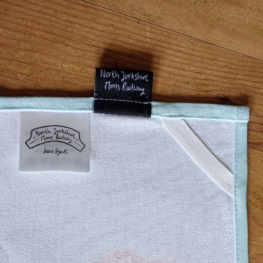 A joyful cotton Tea Towel of the North Yorkshire Moors Railway. With NYMR label and hanging loop. Printed in soy ink on recycled cotton which uses less water and energy as well as reducing the need for pesticides.