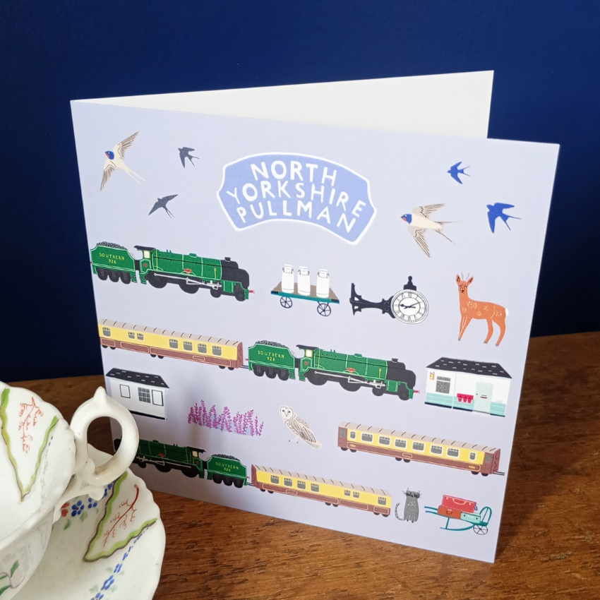 Designed by local Whitby artist Jessica Hogarth, this greetings card features locomotive SR 926 Repton pulling a Pullman Dining carriage and a flurry of the swifts and swallows that are annual visitors to our stations.