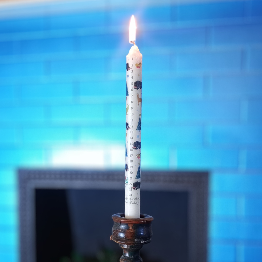 Get into the Christmas mood and count down the days by lighting this advent candle featuring locomotives and festive designs by Jessica Hogarth.