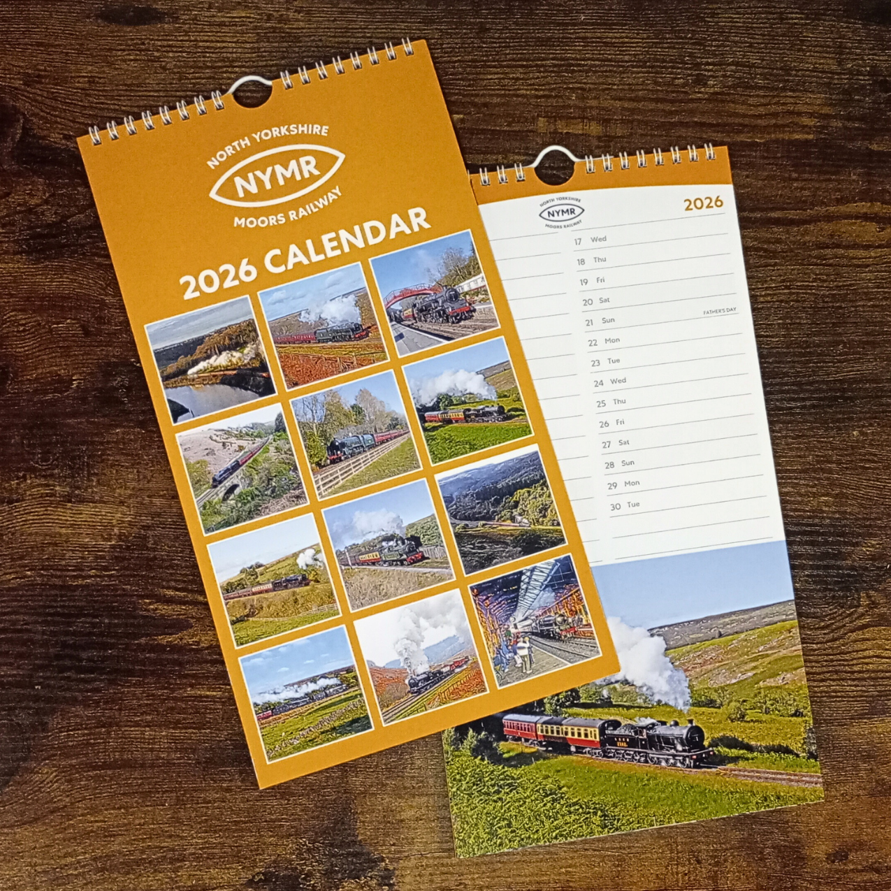 The annual NYMR Calendar with postcard images and hanging loop. An engagement style calendar, featuring 12 fantastic images of locomotives on our line.