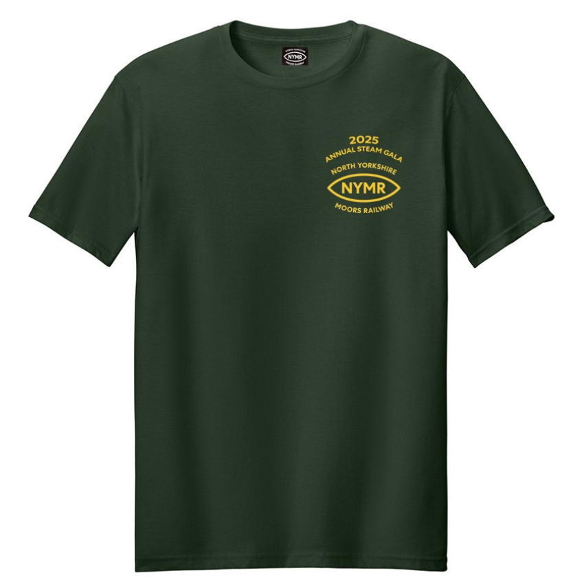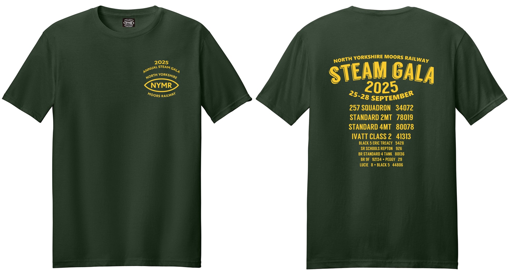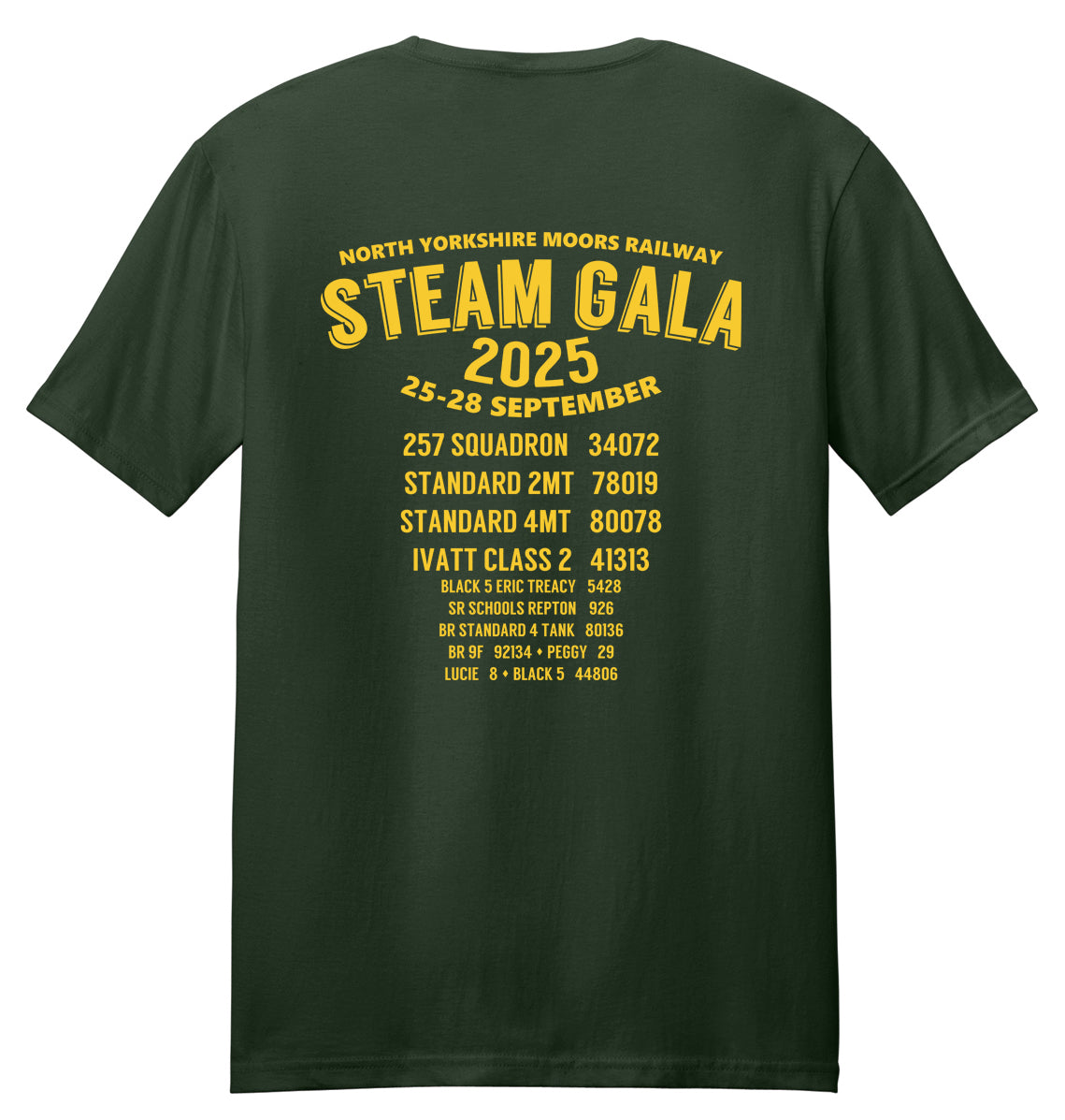 A limited edition T-Shirt for the 2025 Annual Steam Gala. 100% Organic Cotton. Green unisex T-shirt with print front and back. NYMR logo and gala banner on front left pocket - back print shows the locomotive listing for the Gala. Also features the NYMR branded neck label.